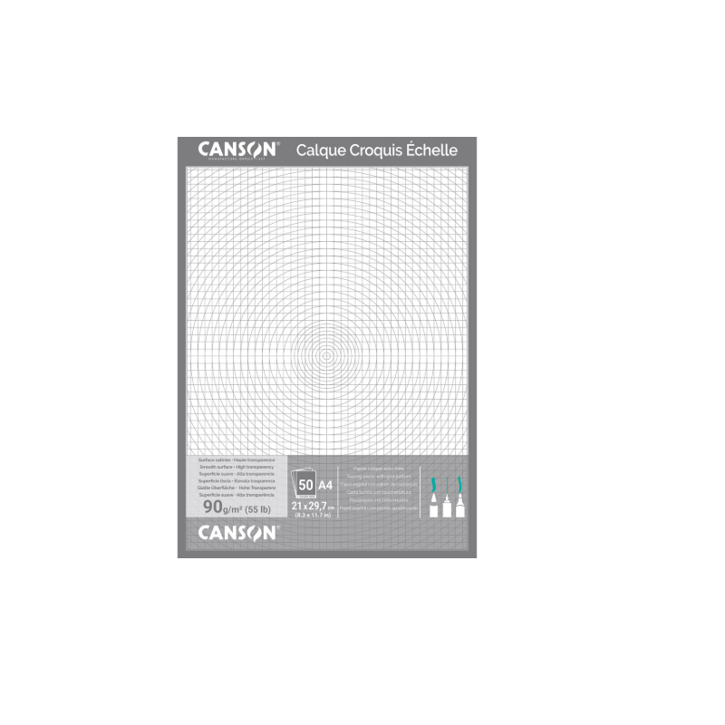 Type : Bloc de papier calque pour dessin technique ou artistique; Format : A4 (21 × 29,7 cm); Nombre de feuilles : 50; Grammage : En général 90 g/m² (existe aussi en 70 ou 110 g/m²); Finition : Surface satinée, extra lisse, haute transparence; Spécificité : Couverture avec quadrillage 5 × 5 mm pour dessin à l'échelle; Sans acide, résistant au vieillissement; Utilisation : Idéal pour le croquis, la mise au net, les perspectives, avec crayon, feutre, stylo technique