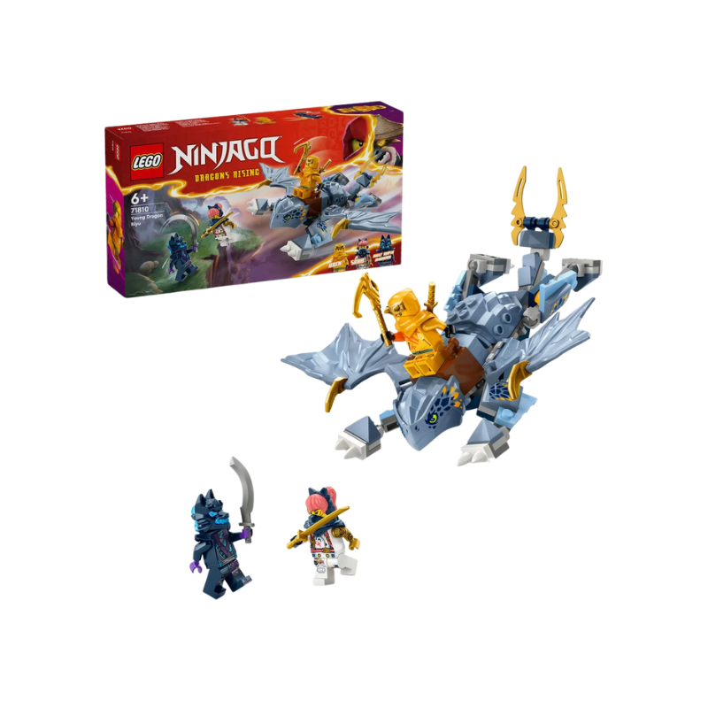 Le set LEGO NINJAGO Le Jeune Dragon Riyu est un modèle articulé inspiré de la série NINJAGO Le Soulèvement des Dragons. Il comprend 132 pièces et inclut trois minifigurines : Arin avec un grappin et un katana, Sora avec un katana, et un Guerrier au masque de loup avec un sabre.