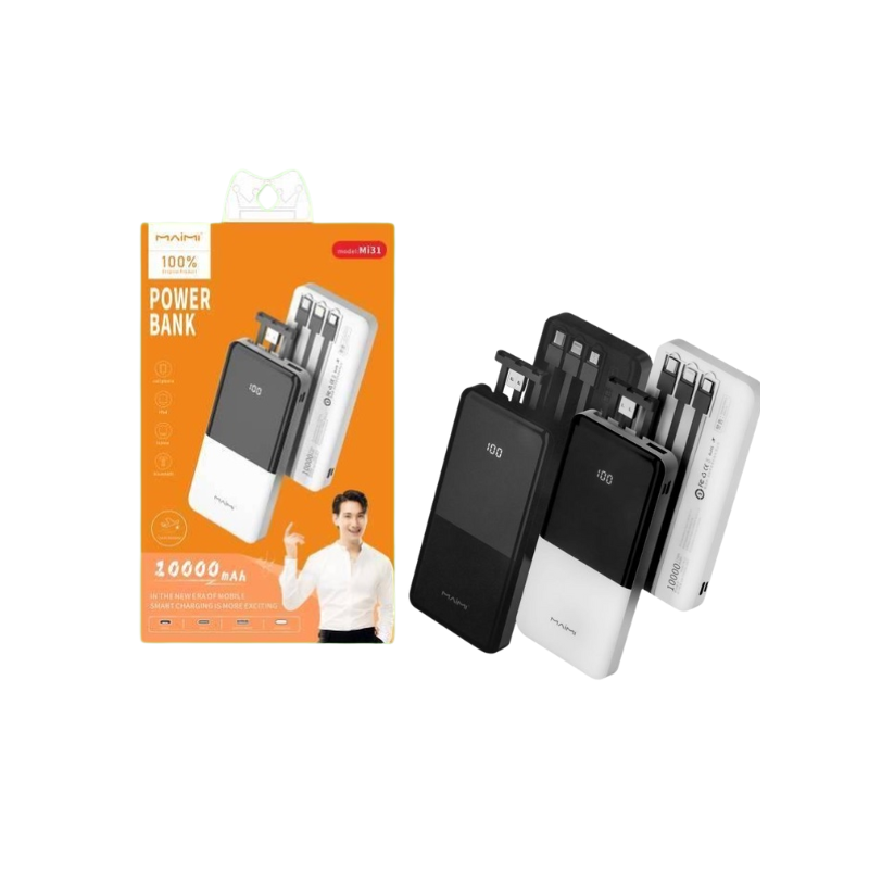 Capacité nominale : 10 000 mAh (~37 Wh) - Batterie : Lithium?polymère de haute densité avec coque en ABS+PC ignifuge - Entrées : USB-C et Micro-USB, jusqu'à 5?V ??2,1?A - Câble 3-en-1 intégré (Micro-USB / Lightning / USB-C) pouvant sortir jusqu'à 5?V ??2,1?A - Sortie totale max : 5?V ??2,1?A - Dimensions / poids : environ 147?×?71?×?21?mm et ~250?g (estimation selon design standard Mi 10?000?mAh) - Câble intégré 3 en 1 : permet de charger directement smartphones ou accessoires sans câble séparé. Idéal pour les trajets ou les usages nomades. - Pas besoin de câble externe - Design robuste et portable - La Mi31 Power Bank 10?000?mAh propose une solution nomade complète avec son câble 3 en 1 intégré et une double sortie pratique. Bien qu'elle ne supporte pas la charge rapide, elle offre fiabilité, portabilité et un bon niveau d'autonomie. Idéale pour recharger un smartphone et un accessoire (ex. écouteurs, montre), sans prise de tête. Si vous recherchez la charge rapide (ex. PD / QC)