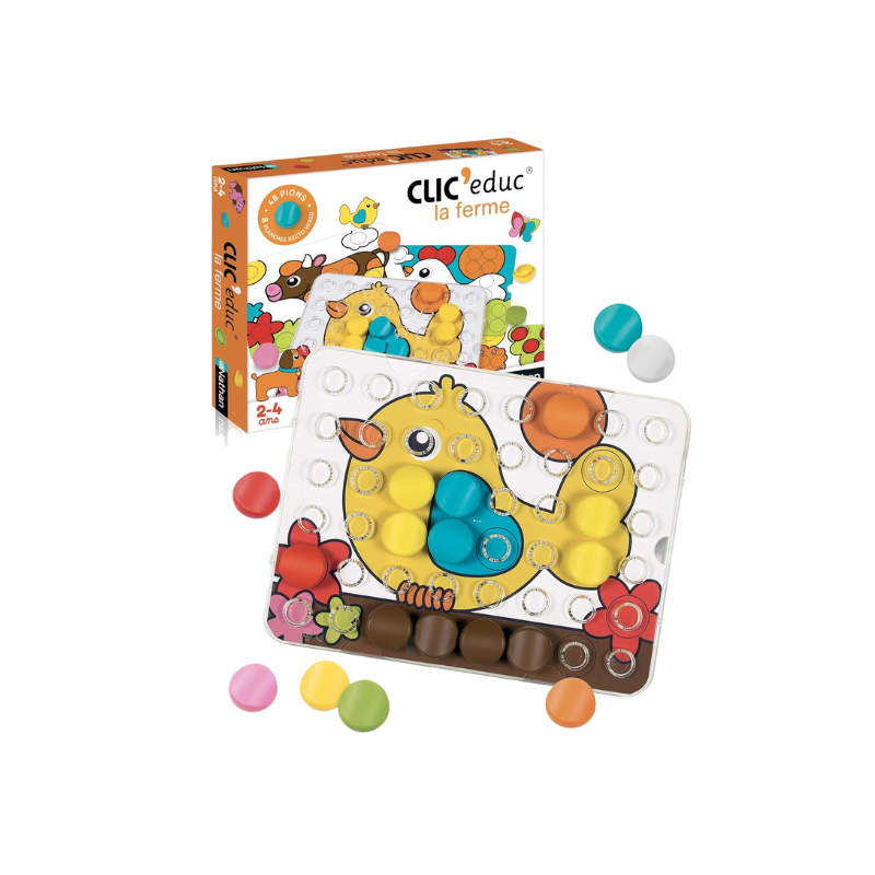 Clic Educ La Ferme est un jeu d'apprentissage interactif qui initie les enfants à l'univers de la ferme tout en stimulant leur réflexion et leur motricité. Grâce à ses pièces colorées à clipser, l'enfant découvre les animaux, les outils et les éléments du quotidien à la ferme tout en développant sa logique et sa coordination main-il.