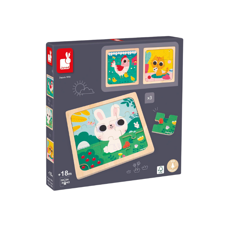 Caractéristiques techniques : Marque : Janod Modèle : Puzzle Trio Nombre de puzzles : 3 × 9?pièces (27 pièces au total) Âge recommandé : dès 18?mois Matière : bois certifié FSC®, peintures non toxiques Thème : animaux (lapin, chat, poulette) Contenu : 3 puzzles avec plateau et images?modèles