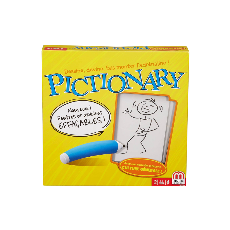 Redécouvrez le célèbre Pictionary, le jeu de dessin incontournable qui garantit des moments de rire et de complicité en famille ou entre amis. Le principe est simple : faites deviner un mot ou une expression uniquement grâce à vos dessins. Pas besoin d'être un artiste, l'essentiel est d'être rapide, créatif et de faire preuve d'imagination pour que votre équipe trouve la réponse.