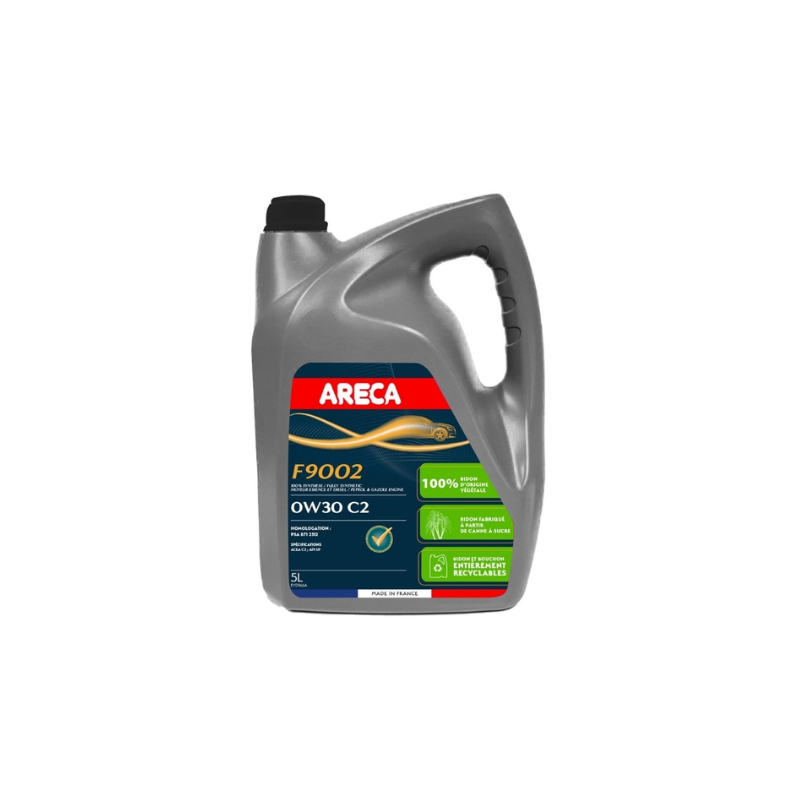 HUILE MOTEUR VÉHICULES LÉGERS - F9002 0W30 C2 FAP 5L ARECA Huile synthétique très haut de gamme, économie de carburant, spécialement destinée aux moteurs Peugeot, Citroën et DS pour lesquels la spécification PSA B71 2312 est recommandée.